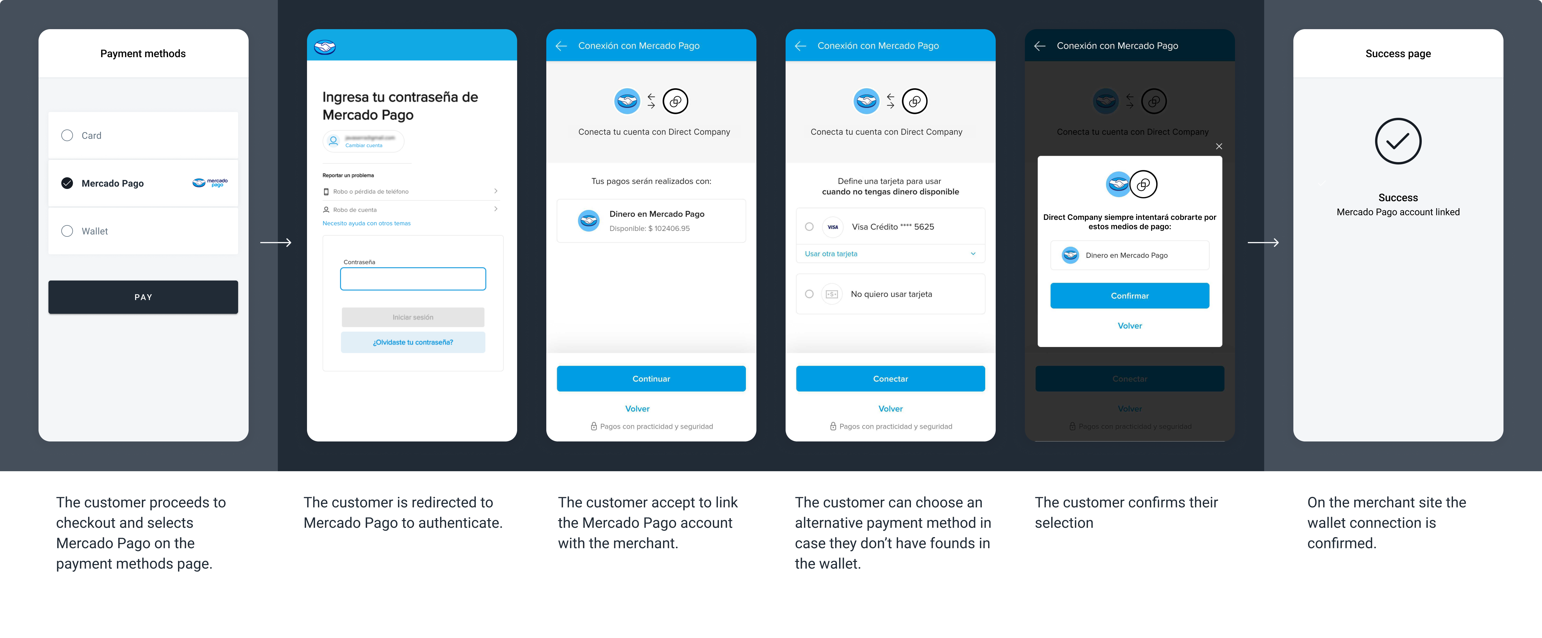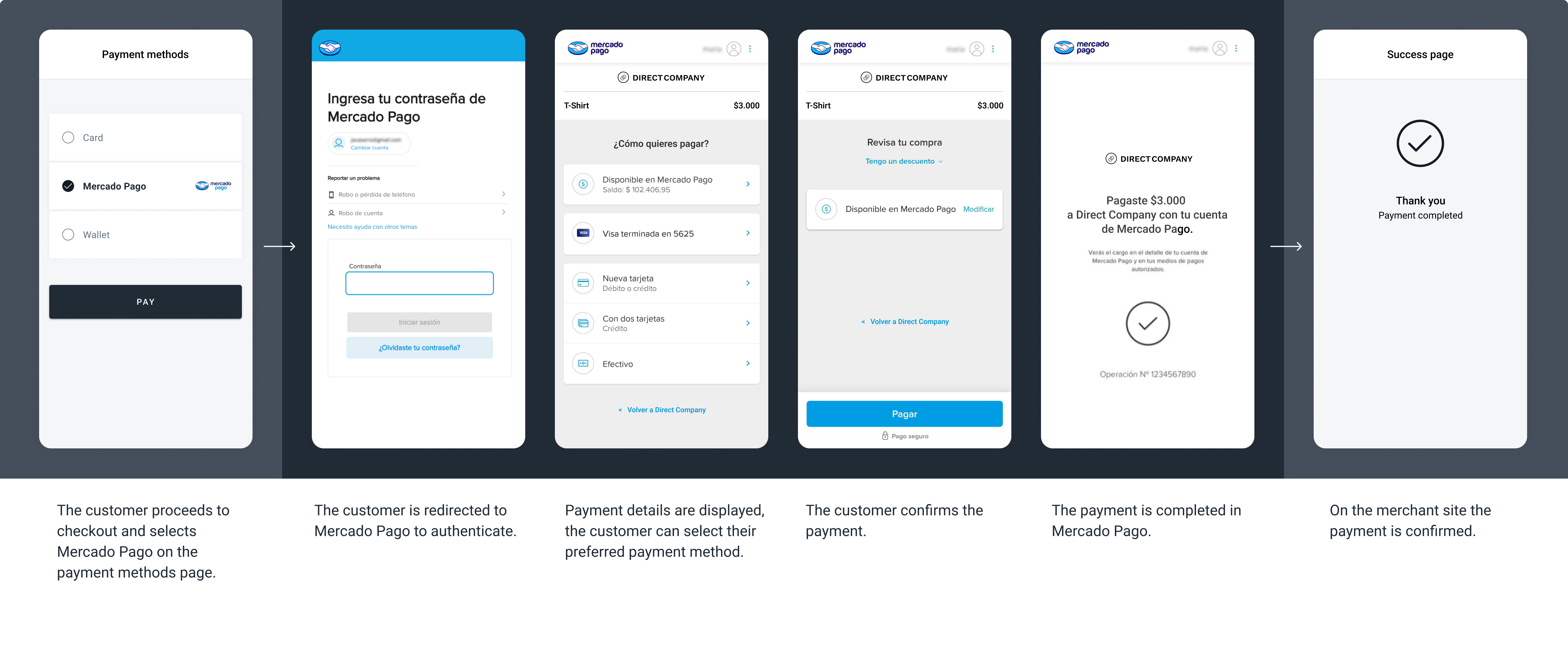 The screenshots illustrate a Mercado Pago one-shot payment redirect flow. The specifics of the flow may vary depending on the payment method selected to complete the payment.