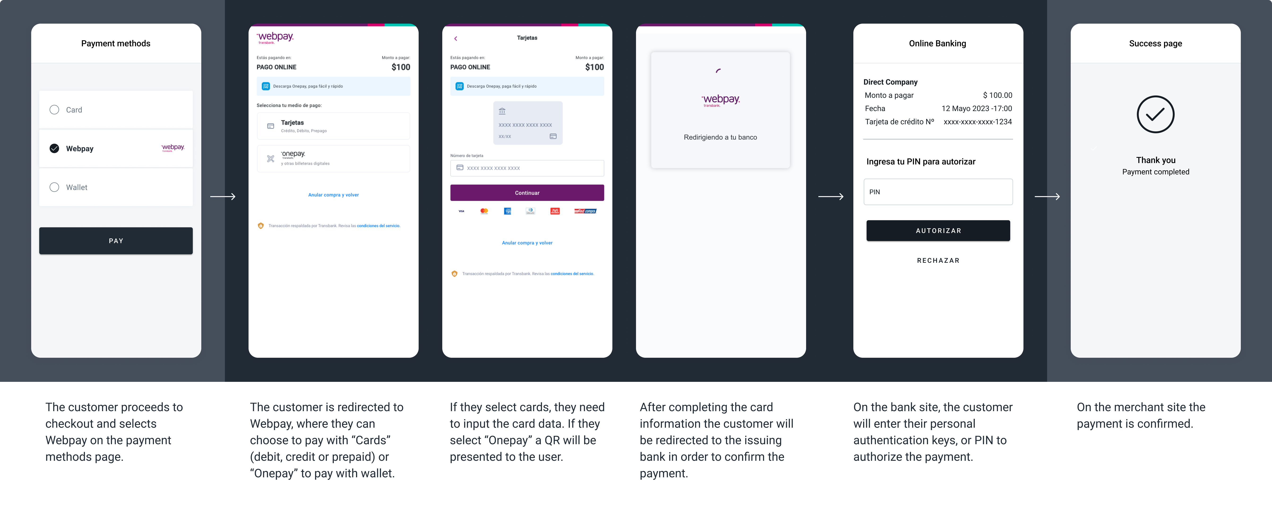 When paying with Webpay, users will be able to choose between credit or debit cards, after which they will be redirected to the card's issuer bank in order to validate/authorize the payment.