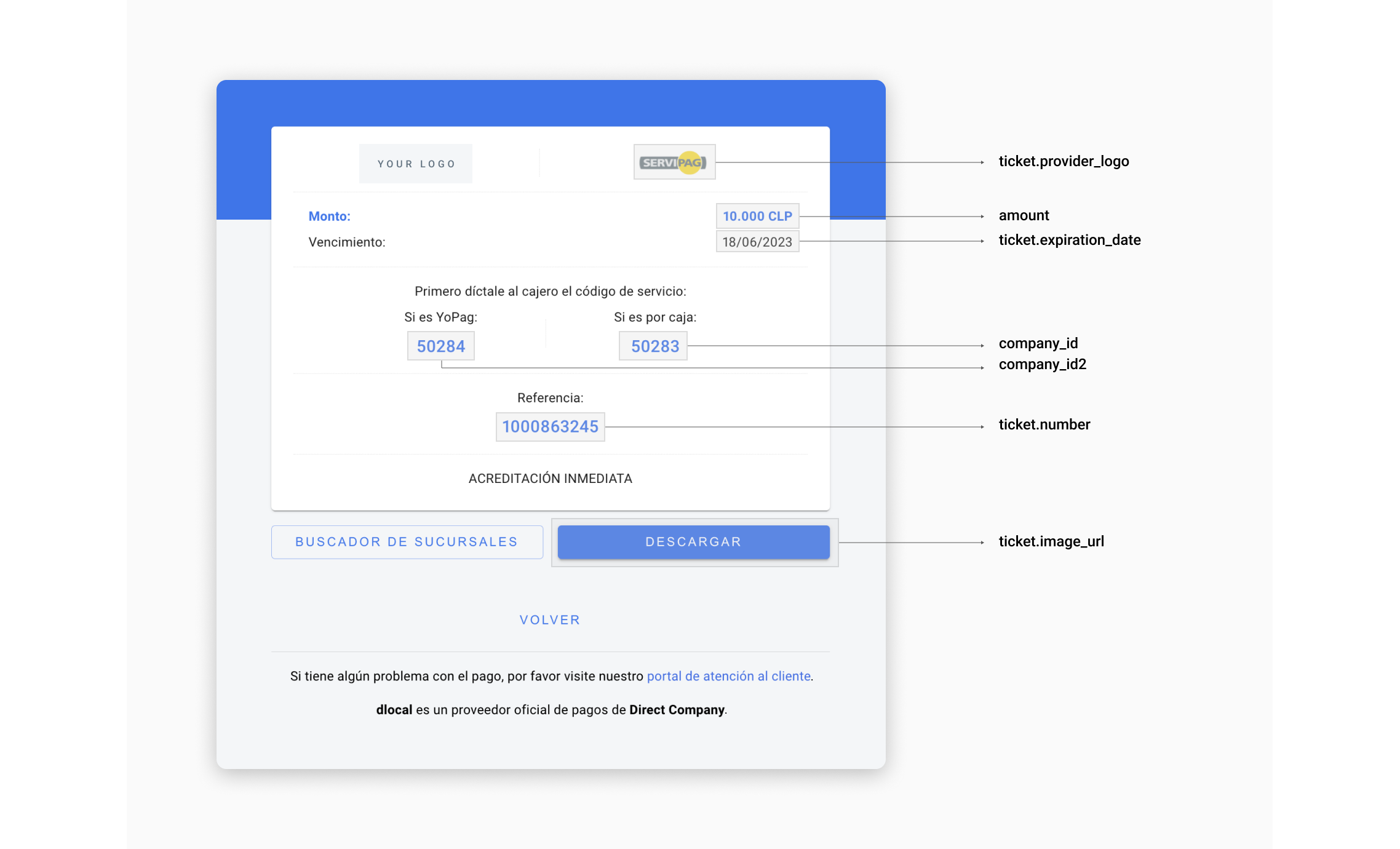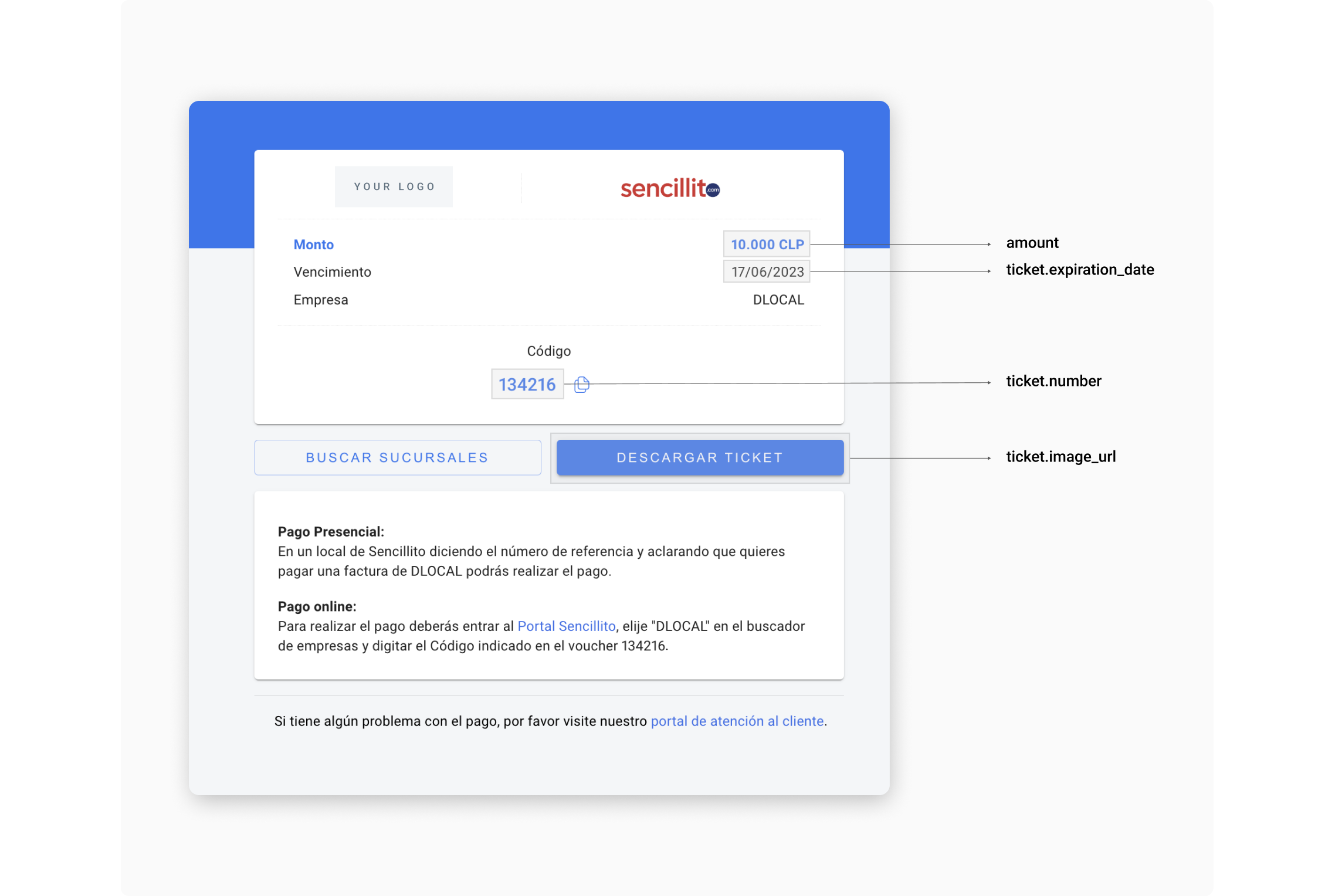 | Ticket Number | It is the number that payers must dictate the cashiers in order to complete payment. Name it "Código". |