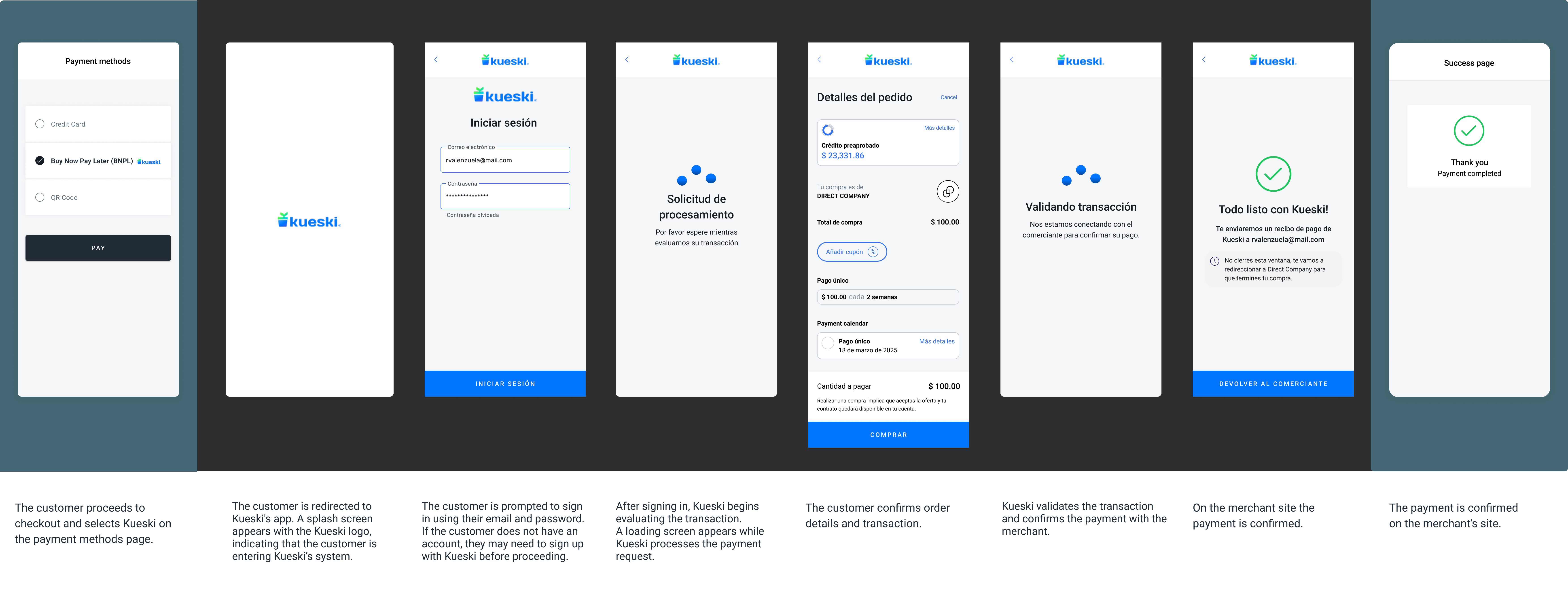 The screenshots illustrate a Buy Now Pay Later (BNPL) - Kueski Pay redirect flow.