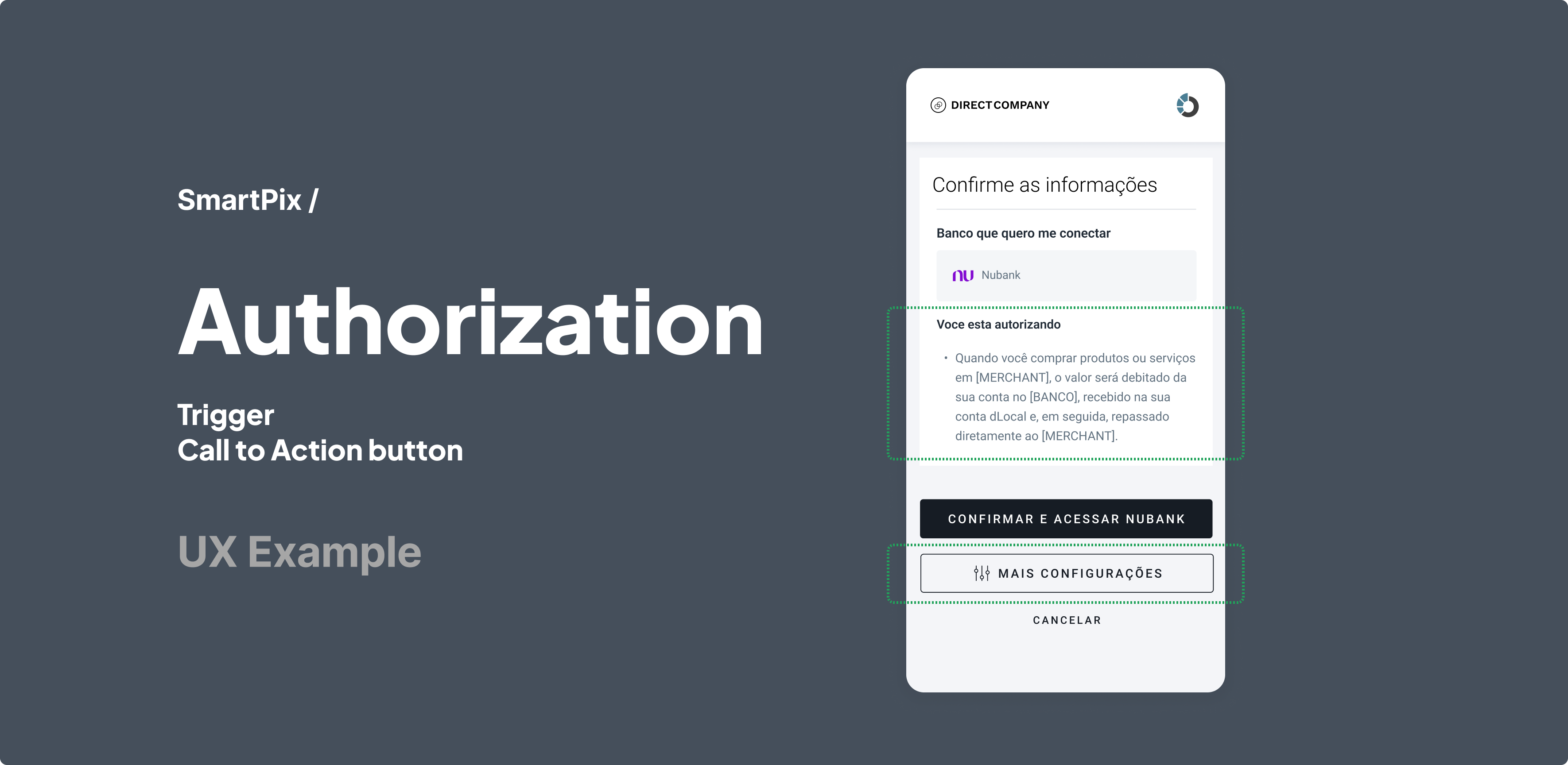 - A Call to Action button (“Mais configurações”) that optionally allows users to set transaction limits and the authorization period in the following steps.