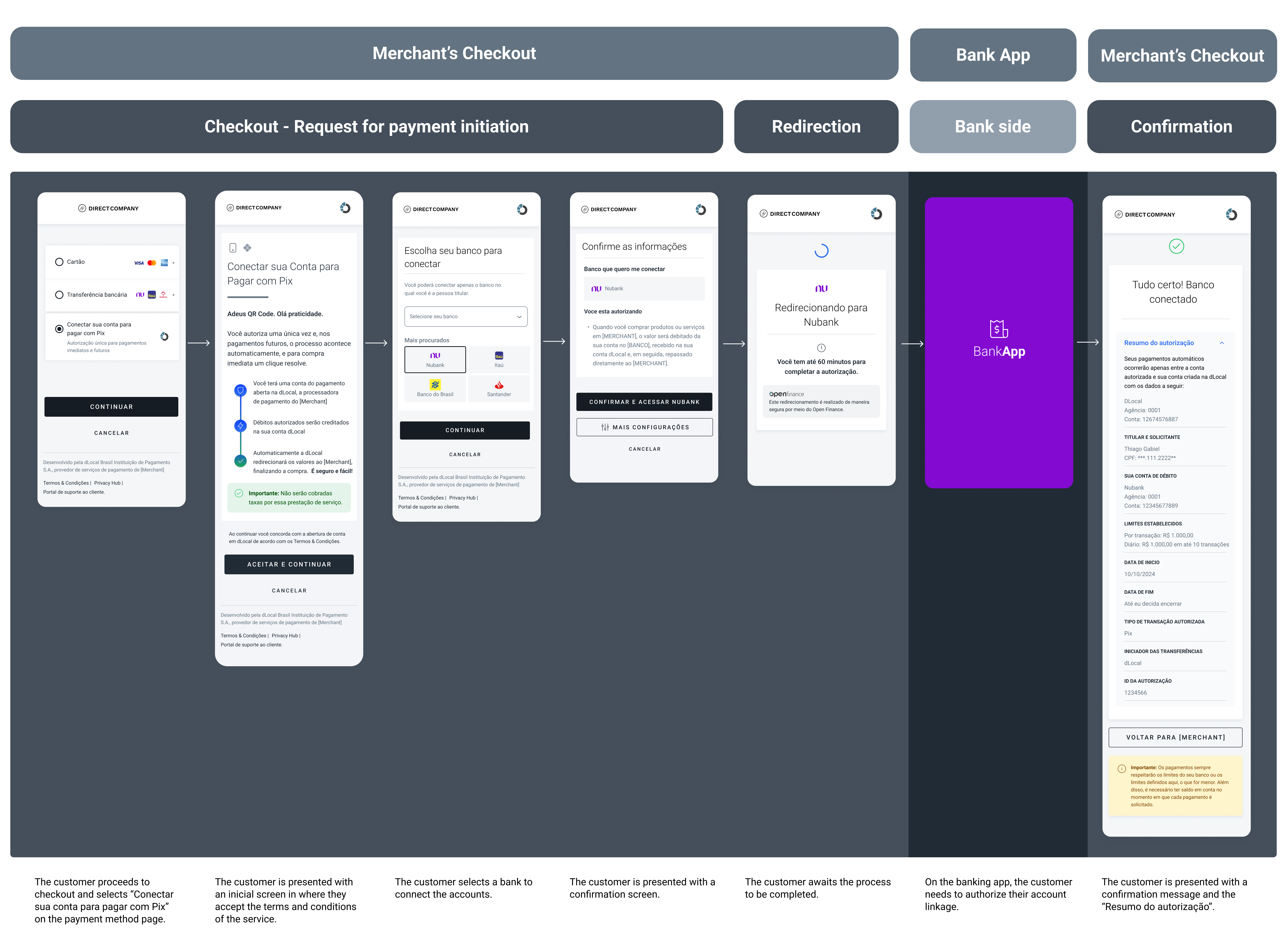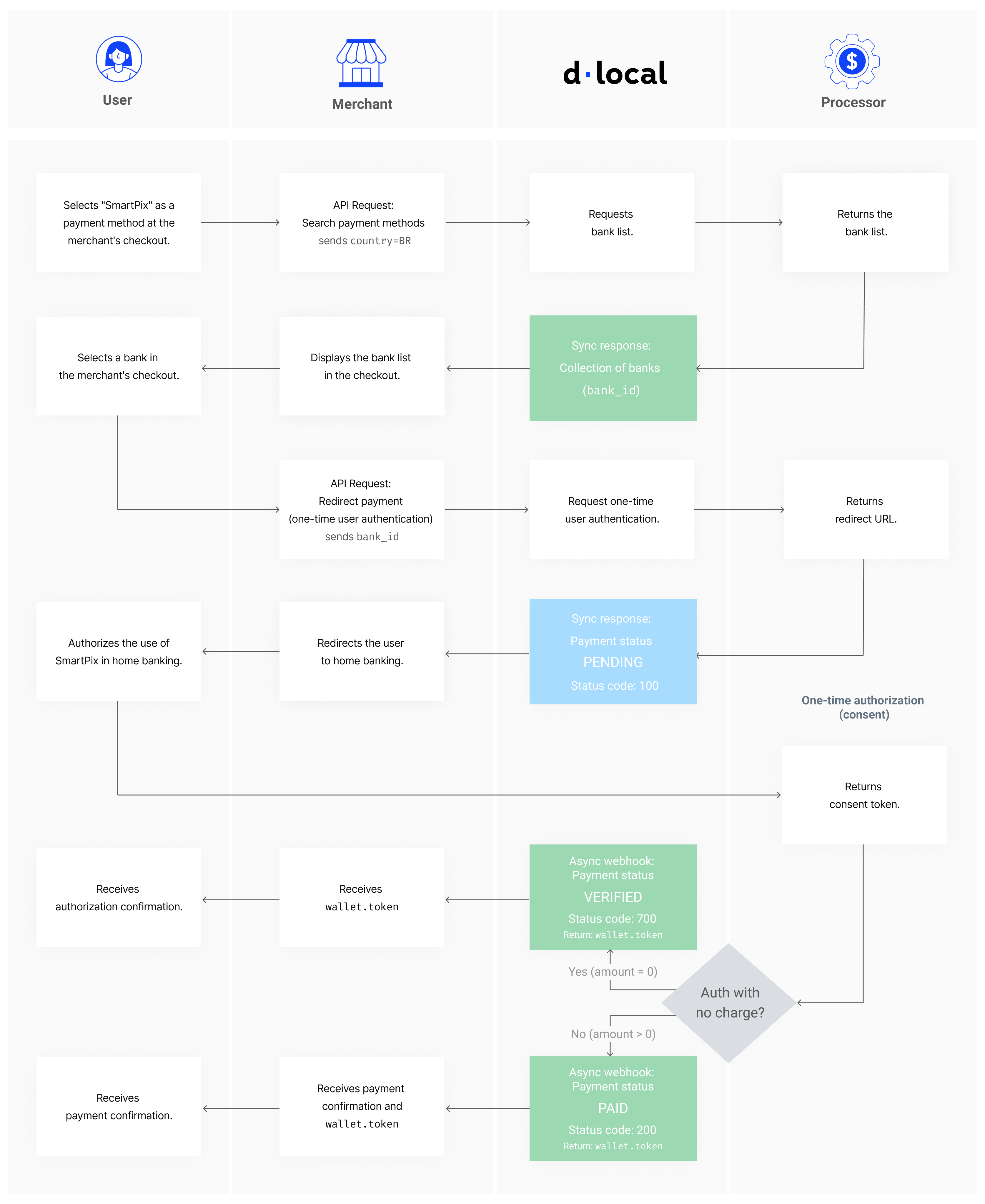 The one-time authorization requires the user to select their preferred bank at the merchant's checkout, being redirected to their online banking to authorize the use of their Pix account for future payments. dLocal will provide a token via API that links the user to their account for subsequent payments.