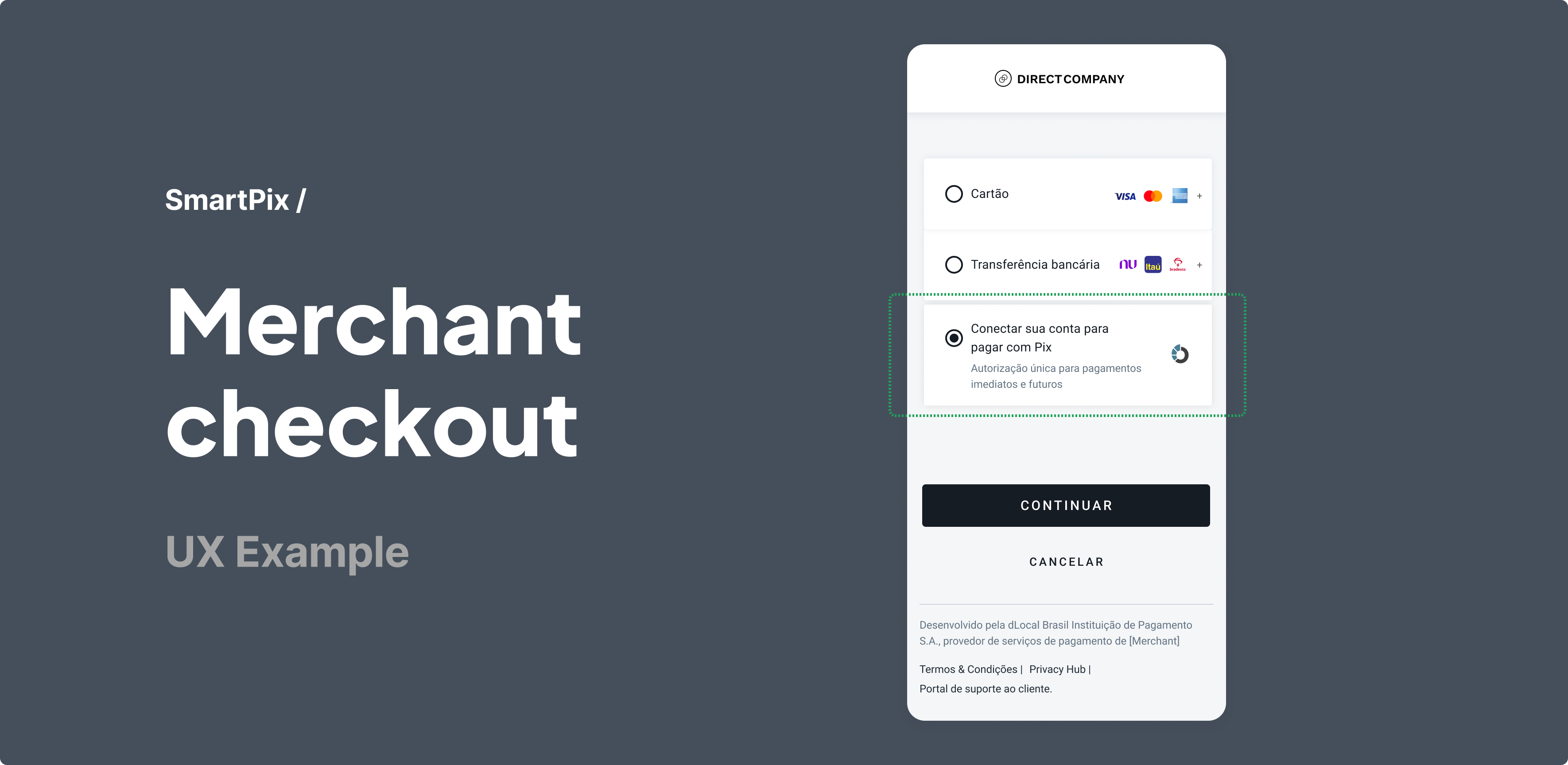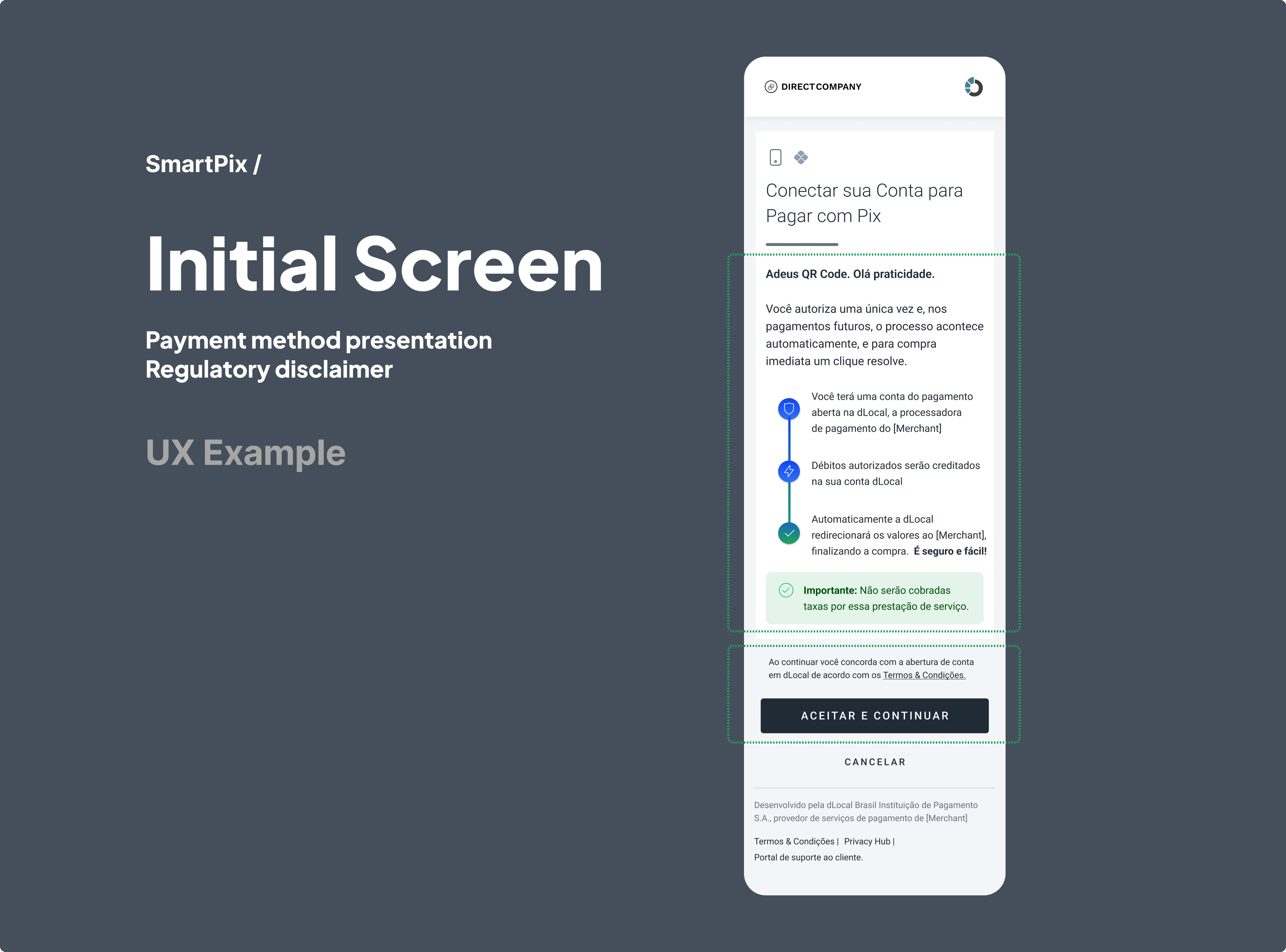 - The message for the payer regarding the opening of the payment account that will be opened in the payer's name with dLocal, as well as the presentation for terms and conditions. The required wording is: “Ao continuar, você concorda com a abertura de uma conta de pagamento na dLocal, de acordo com termos e condições disponíveis aqui.”