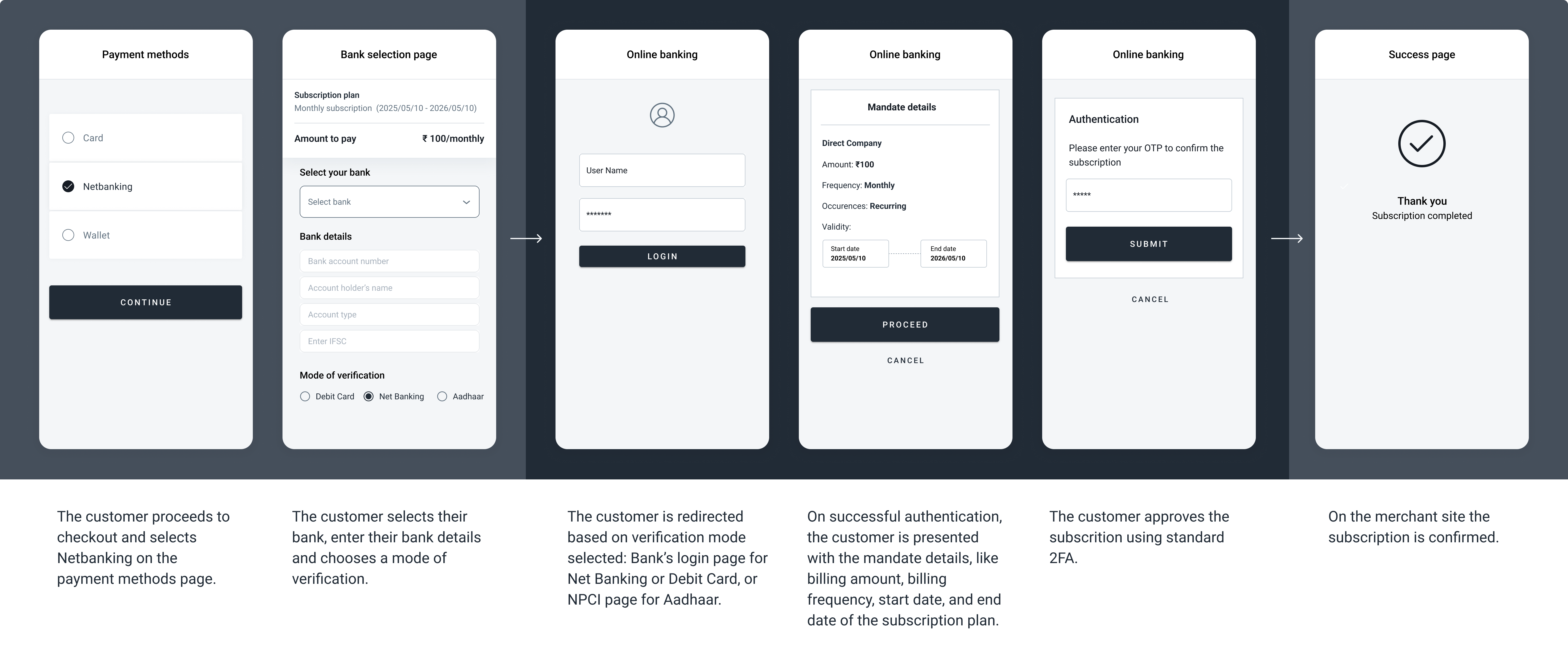 _The screenshots illustrate a generic redirect NetBanking recurring enrollment flow. The specifics of the flow can change depending on the bank selected to complete the transaction._