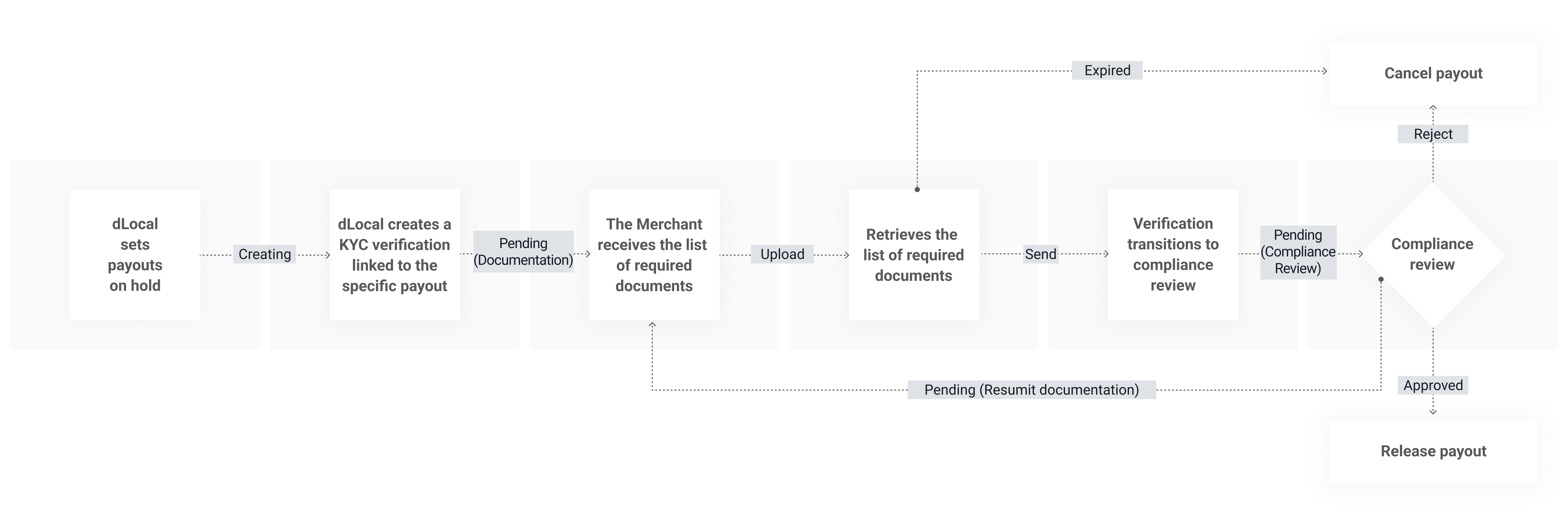ON_HOLD_BY_COMPLIANCE. - Dlocal creates a KYC verification linked to the specific payout.