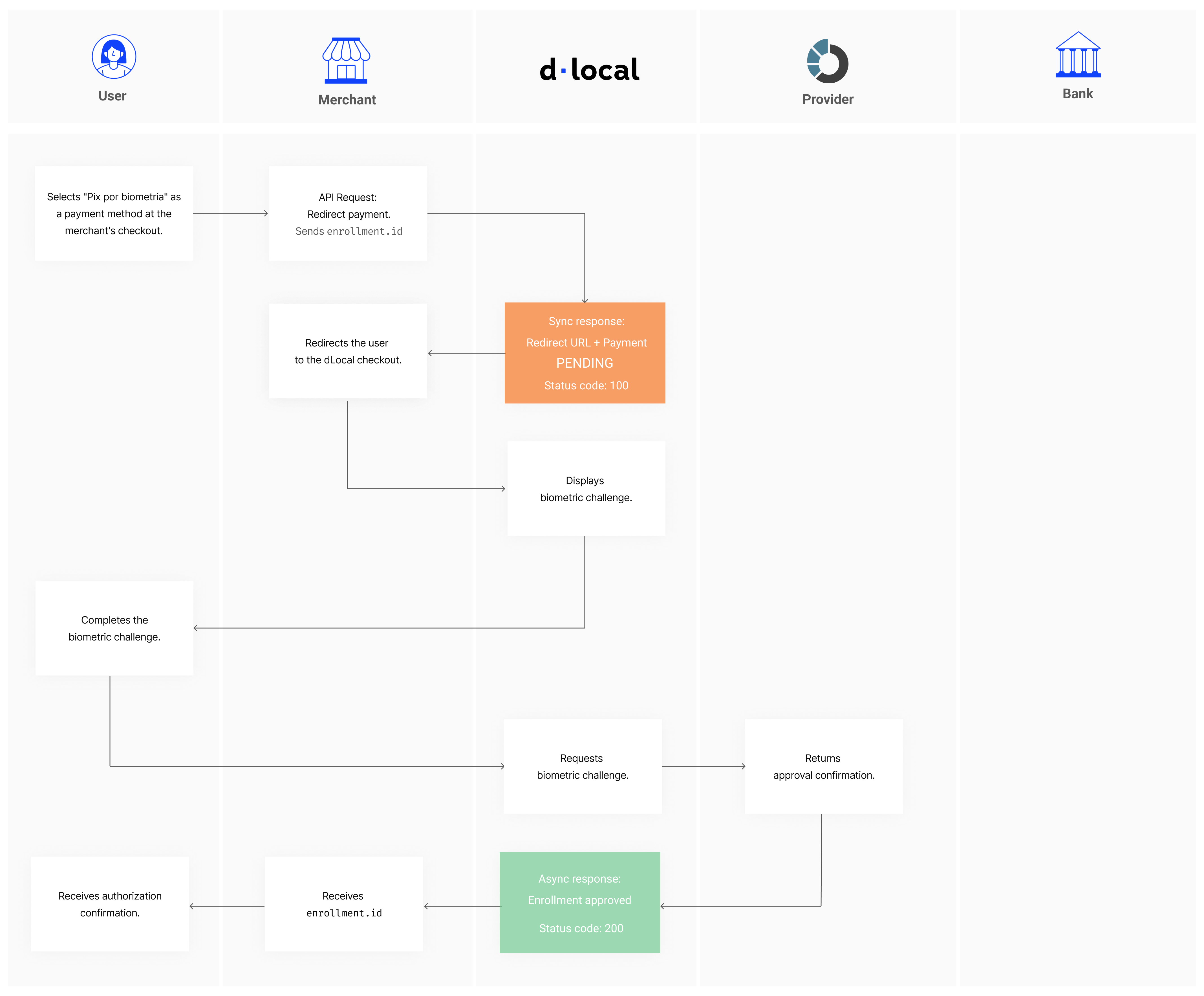 After the user completes the one-time enrollment, merchants can initiate subsequent Pix with Biometrics payments using the enrollment ID returned by dLocal. This identifier links the user to their authorized bank account and must be included in every payment request.